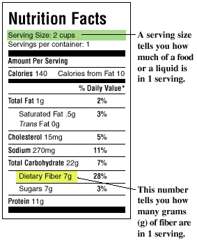 Fiber on Nutrition Facts Labels - Fiber Facts When comparing items with a nutrition facts label like bread, cereal, or breakfast bars, you should select the item with at least 2-3 grams of fiber per serving. You can also compare the amount of fiber to the percent daily value on the food label.