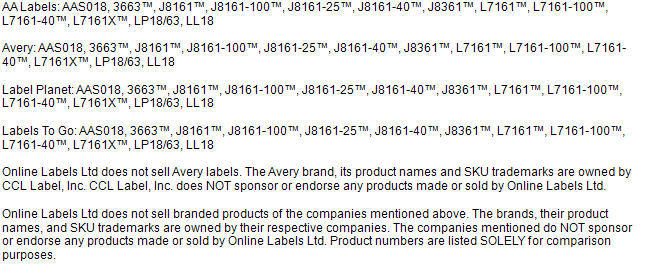 All label Template Sizes. Free label templates to download. Address Label 2.5" x 1.563" 18 labels per sheet Download. WL-950 Address Label 2.625" x .875 "33 labels per sheet Download. WL-875 Address/Mailing Label 2.625 " x 1 "30 labels per sheet Download. WL-225 Diskette Label ... *WorldLabel.com does not sell Avery® labels. The Avery® brand, its product names names, and SKU trademarks are owned by ...