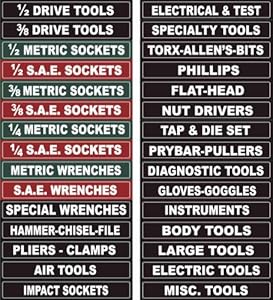 Magnetic Toolbox Labels and Magnetic Measuring Tape Magnetic Toolbox Labels. Price: $9.95. Quantity: Magnetic Measuring Tape. Flexible magnetic strip features standard and metric measurement. Can be used on metal surfaces for hands-free measuring. One meter long with UV-resistant red and blue ink on white vinyl surface. Diamention: 2.6cm x 1 meter ( 1" w x 39.37" L) Amazon.com: tool box drawer magnetic labels 1-48 of 509 results for "tool box drawer magnetic labels" RESULTS Tool Box Organizational Magnetic Labels Fits All Brands of Steel Tool Chest, Drawer Labels for Organize Boxes, Drawers Cabinets Quick and Easy (Black, 4.5 x 0.75 Inches) 219 $2299 Save more with Subscribe & Save Get it as soon as Thu, Sep 1 Amazon.com : Tool Box Organizational Magnetic Labels Fits All Brands of ... Ultimate Magnetic Tool Box Organizer Labels (Green edition) organize boxes, drawers & cabinets "Quick & Easy", fits all brands of 'Steel' tool chest Craftsman, Snap-on, Mac, Matco & Cornwell … $14.99 MSTRBLUE001 Steellabels Mechanics Master Set Chrome Socket Labels: Presidential Edition, Blue $19.95 craftsman magnetic labels tool box label magnets
